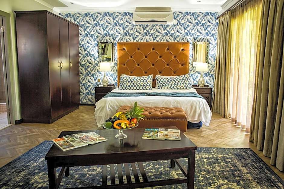 This spacious suite includes a seating area with a sofa, and a private furnished balcony with panoramic views.